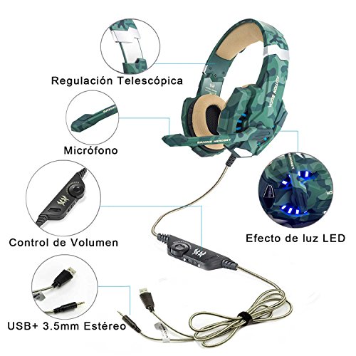 - VersionTECH Auriculares Gaming con Microfono de Diadema-Bass OverEar 3 5mm Jack Luz LED Volumen Control Bajo Ruido para Nueva Xbox One Nintendo Switch PC Ordenador Port til M vil Camuflaje