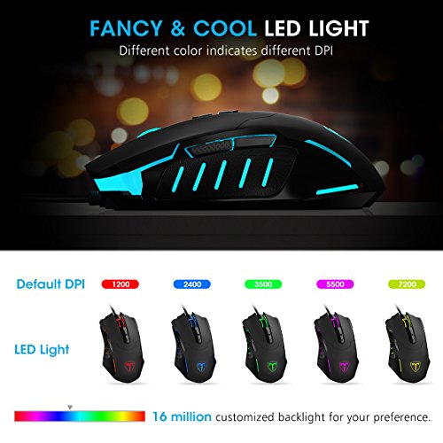 - ~ã€5 DPI AJUSTABLE】La configuración de software apoya una gama amplia de DPI de 500 a 7200. Eleja y personalice su propio DPI para asegurar un seguimiento más preciso, disfrutar más del juego. Por defecto cinco niveles disponibles de DPI 1200/2400/3500/5500/7200 DPI.~