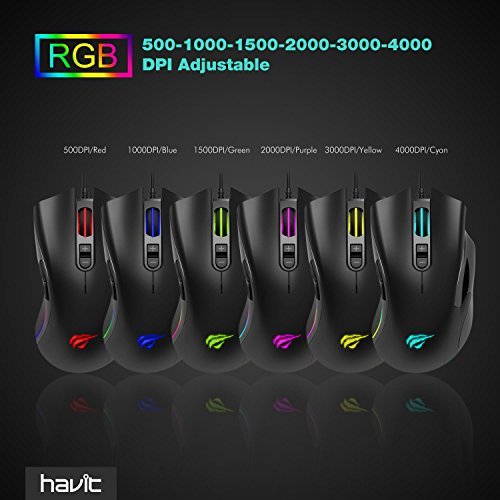 - ~6 DPI ajustables (máx.- 4000): 500/1000/1500/2000/3000/4000 DPI, indicador DPI por defecto (Rueda de desplazamiento y logo) color rojo/azul/verde/morado/amarillo/cian, proporciona una gama de sensibilidad y control de cursor perfectos.~