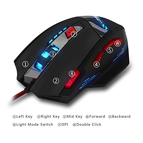 - ~8 botones (izquierdo/derecho/MID/adelante/atrás/DPI interruptor de modo de luz/Fire clave \), hacia adelante y hacia atrás botones Assist para navegar página web y Fire clave ayuda a juegos para ganar en facilidad~